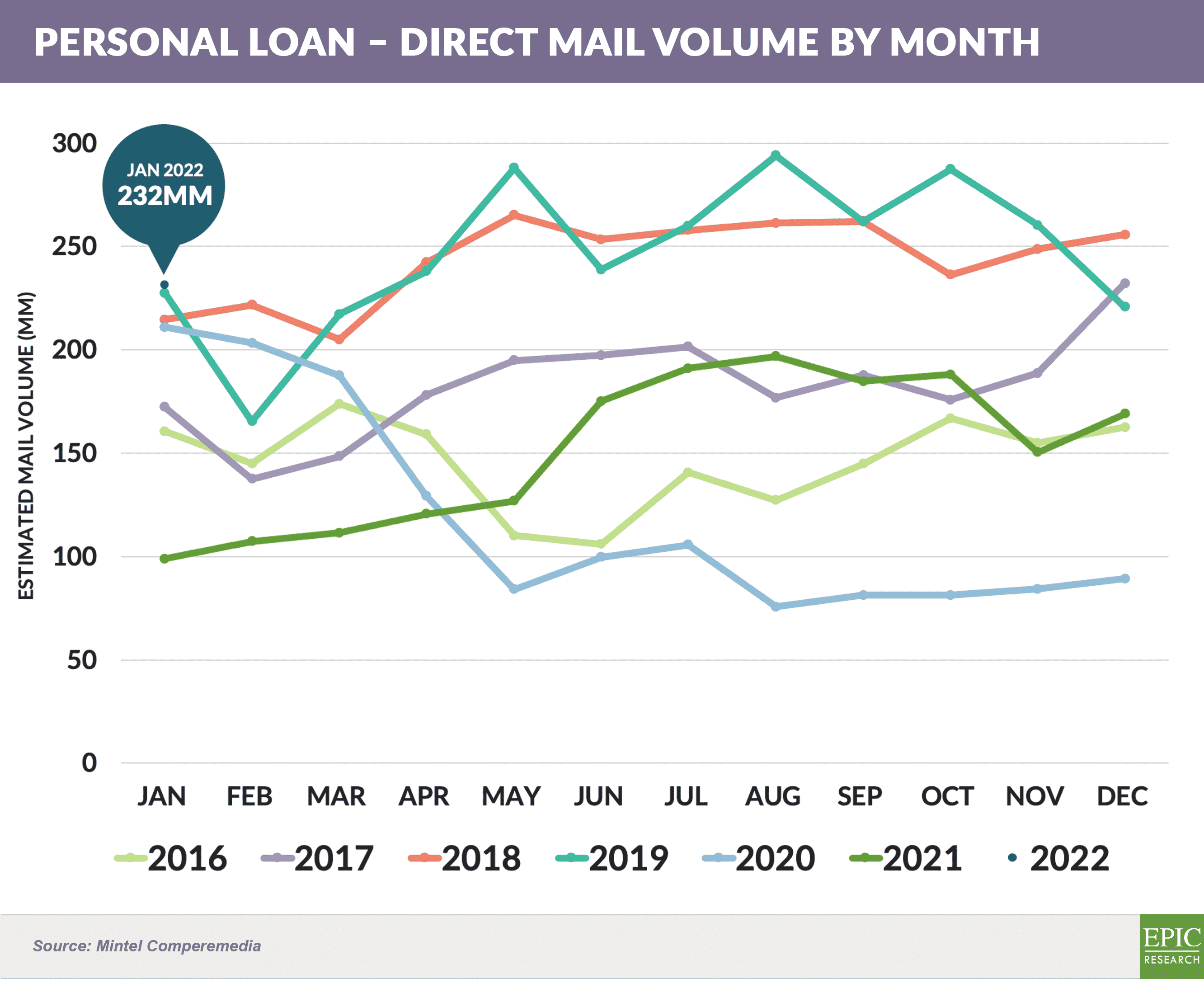 - January ’22 mail volumes were predominantly higher than January ’21, with personal loans, credit cards, and in-school student loan mail volumes having now returned to pre-pandemic levels and checking, HELOC, and education refinance mail volumes still below prior quantities